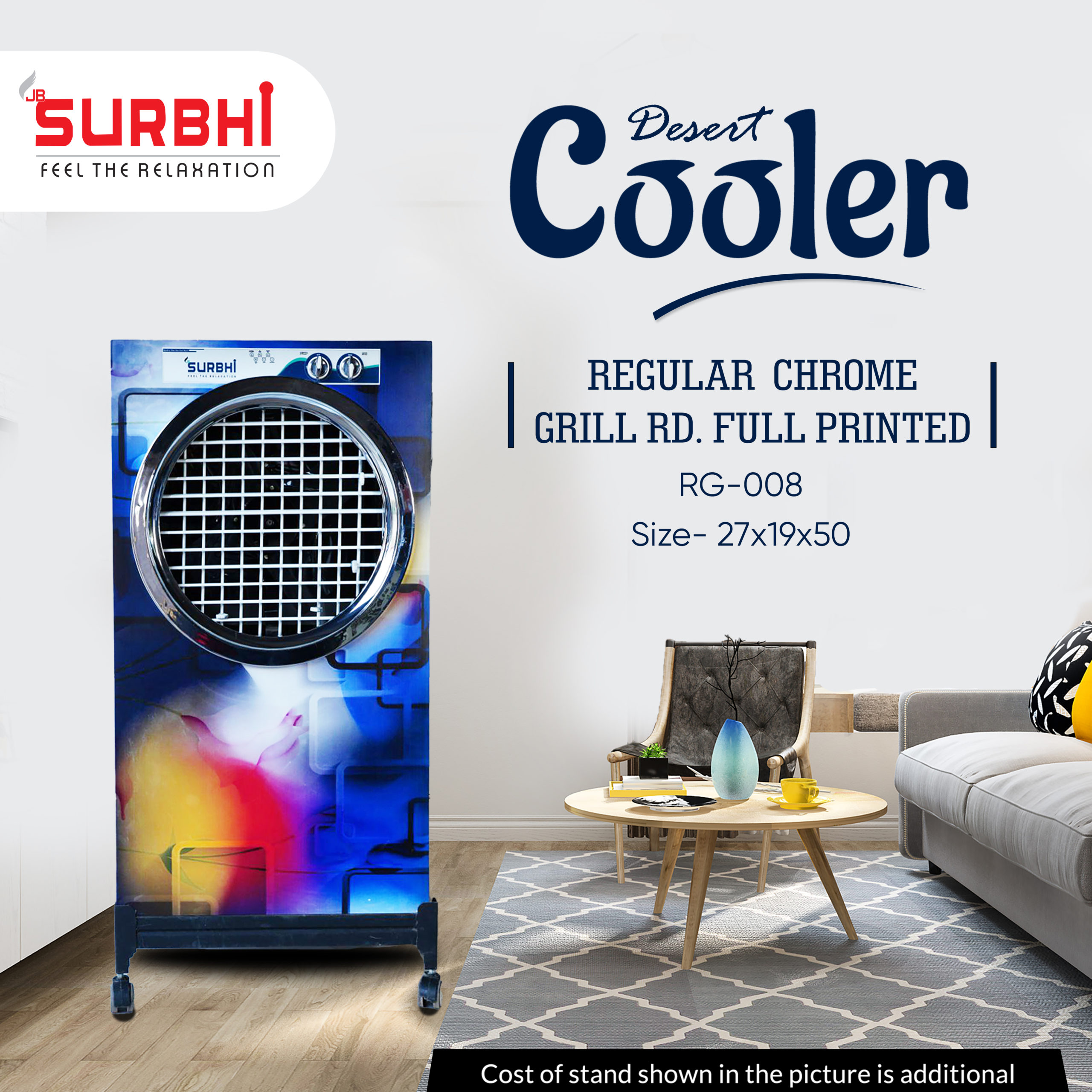Experience style and powerful cooling with the Surbhi Reg Cooler with Round Chrome Frame, Fully Printed Body, and 18 inch Exhaust Fan.